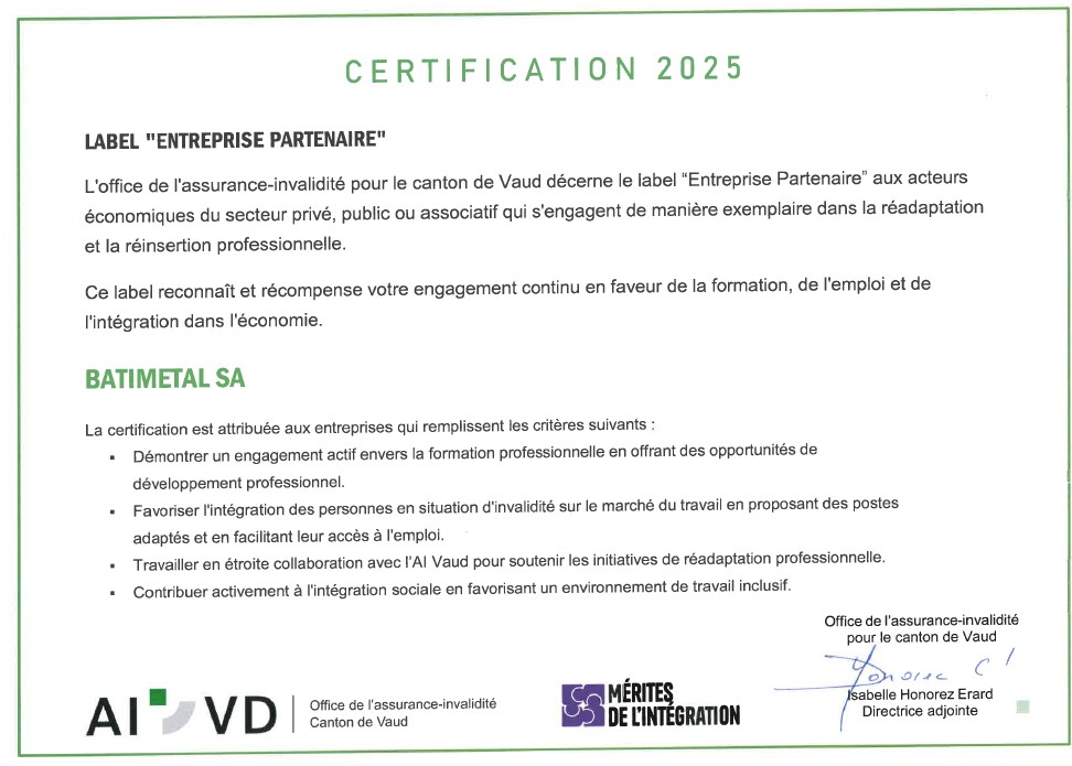 Reconnu par la certification AIVD, Batimetal agit concrètement pour l’insertion professionnelle dans le canton de Vaud.