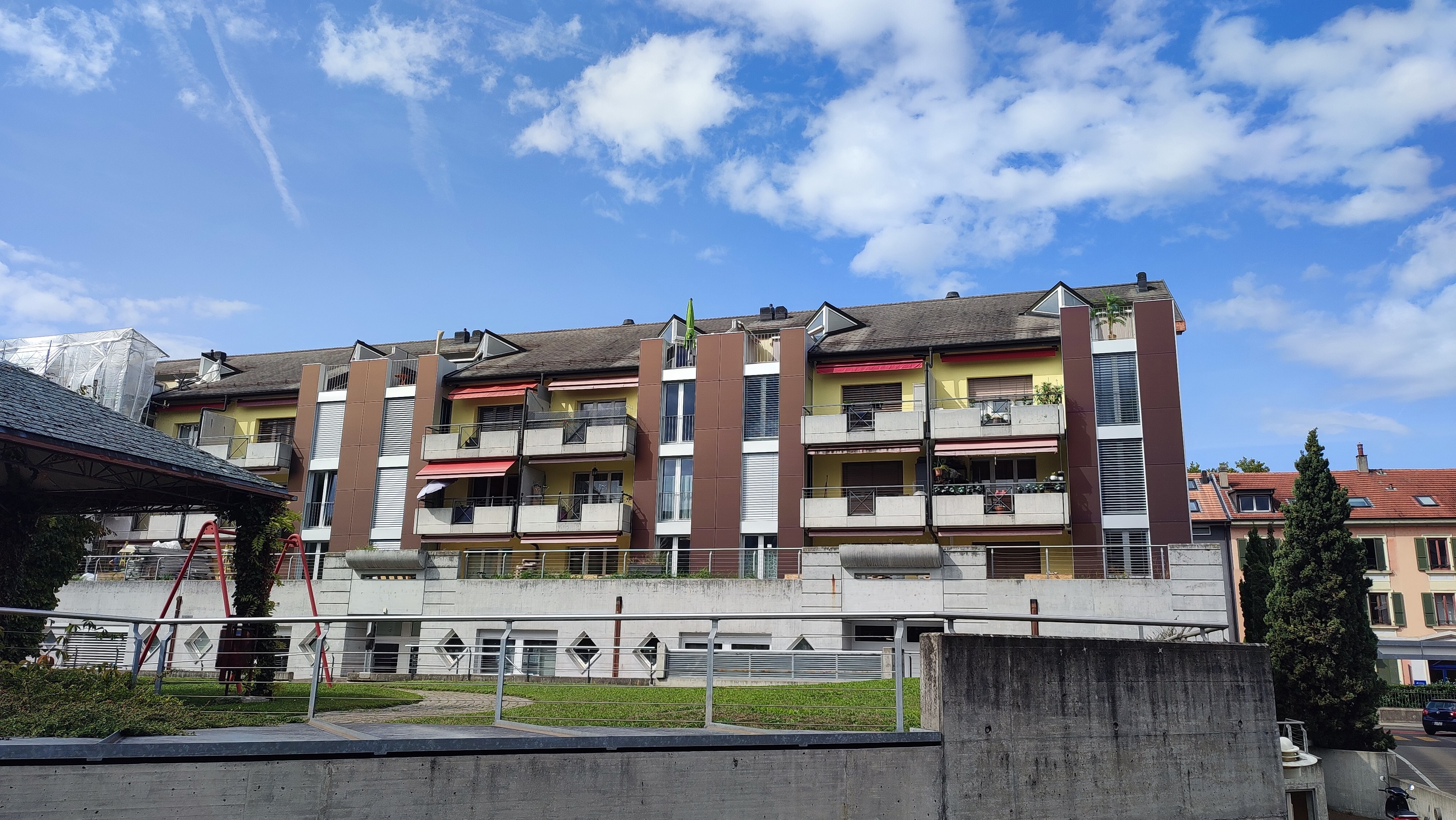 Rénovation complète réussie à Yverdon : façade, fenêtres et supports pour panneaux solaires, pour un rendu alliant esthétique, performance technique et production d’énergie.